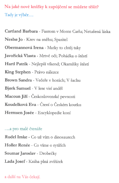 Připomínáme, že již zítra místní knihovna zahajuje provoz. Návštěvní doba každé úterý od 16 do 18 hodin!