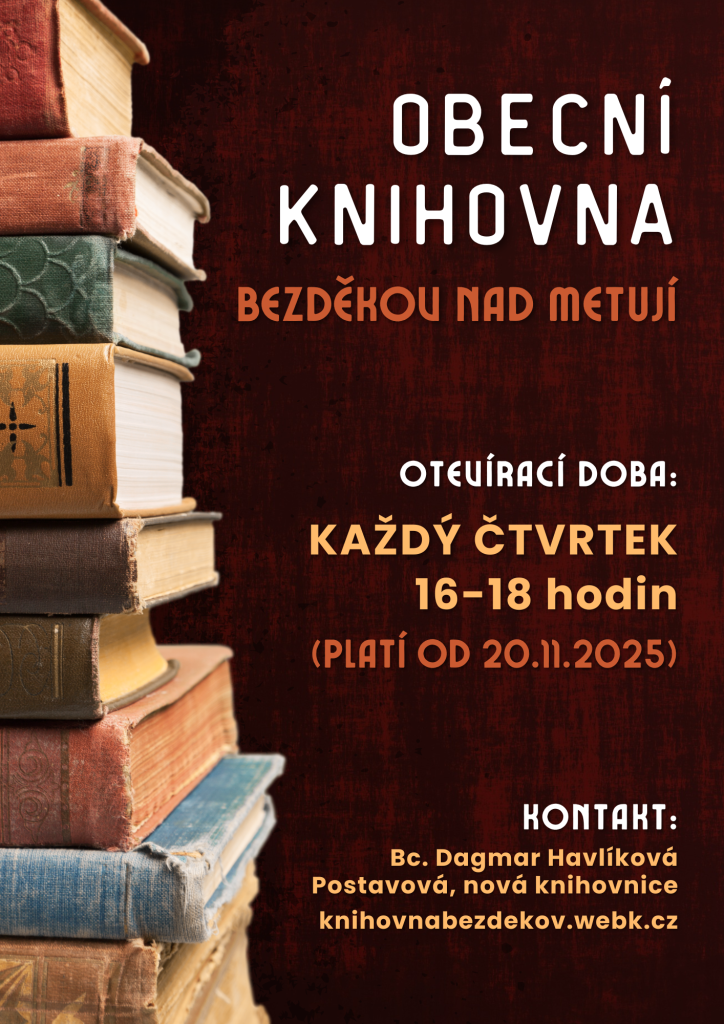 Obecní knihovna v Bezděkově nad Metují má od listopadu novou knihovnici, paní Bc. Dagmar Havlíkovou Postavovou. Paní knihovnice se již připravuje na provoz a bude Vám k dispozici při výběru knih a také při rozvoji společných aktivit v knihovně.