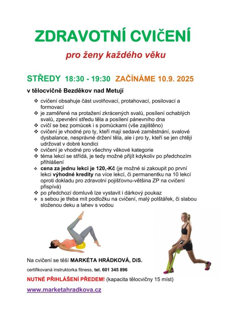 Od 10. září 2025 startuje v tělocvičně ZŠ Bezděkov nad Metují zdravotní cvičení pro ženy každého věku pod vedením Markéty Hrádkové.