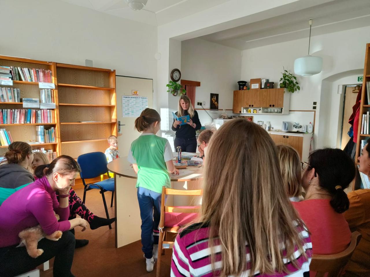 Děti přišly ve velkém počtu. Nejdříve jsme si o autorovi něco řekli (i to, že ho můžou vidět každou sobotu tančit ve StarDance). A pak se začalo číst. Kdo chtěl mohl číst, kdo nechtěl nemusel, bylo to na každém z dětí. Mile mě překvapilo, že většina se rozhodla číst, musím pochválit jejich odvahu, protože i když se znají ze školy, ale číst před maminkami a v jiném prostředí než ve třídě, to chce odvahu, jsem ráda, že ta jim nechyběla. Při čtení bylo i veselo, smáli jsme se všichni, někdo stihl nakreslit i obrázek. Všechny nás překvapilo, že autor v knížce použil slovo pukrle.